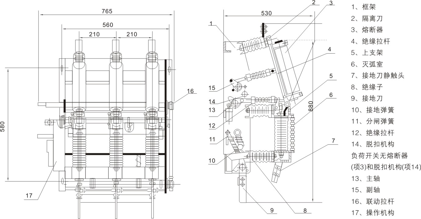 FZN21-12D/T630-20、FZN21-12DR/T125-31.5型高壓真空負(fù)荷開關(guān)及組合電器用于三相交流12KV、50Hz的配電系統(tǒng)中,具有結(jié)構(gòu)緊湊、體積小、重量輕、壽命長、關(guān)合開斷能力強(qiáng)、安全可靠等優(yōu)點(diǎn),與熔斷器配合使用(簡稱組合電器),可替代造價(jià)較高的斷路器,其操作和維護(hù)簡單方便。